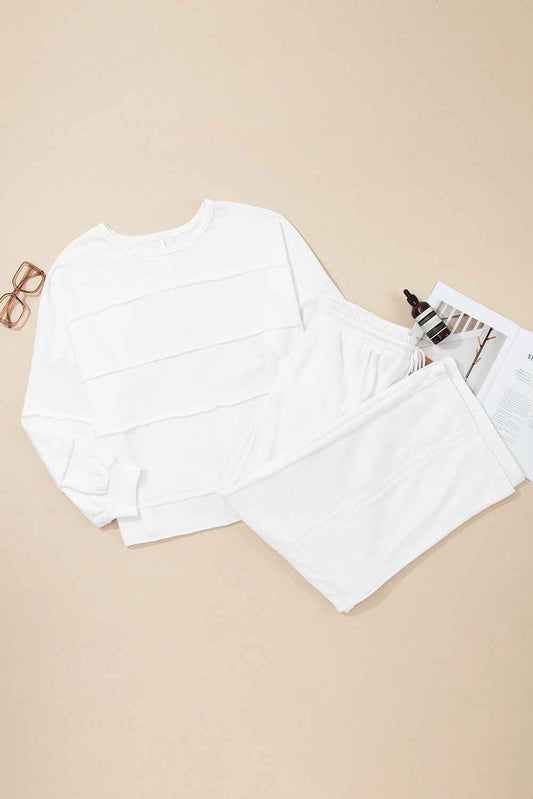 Plus Size Solid Raw Seam Top and Drawstring Pants Set