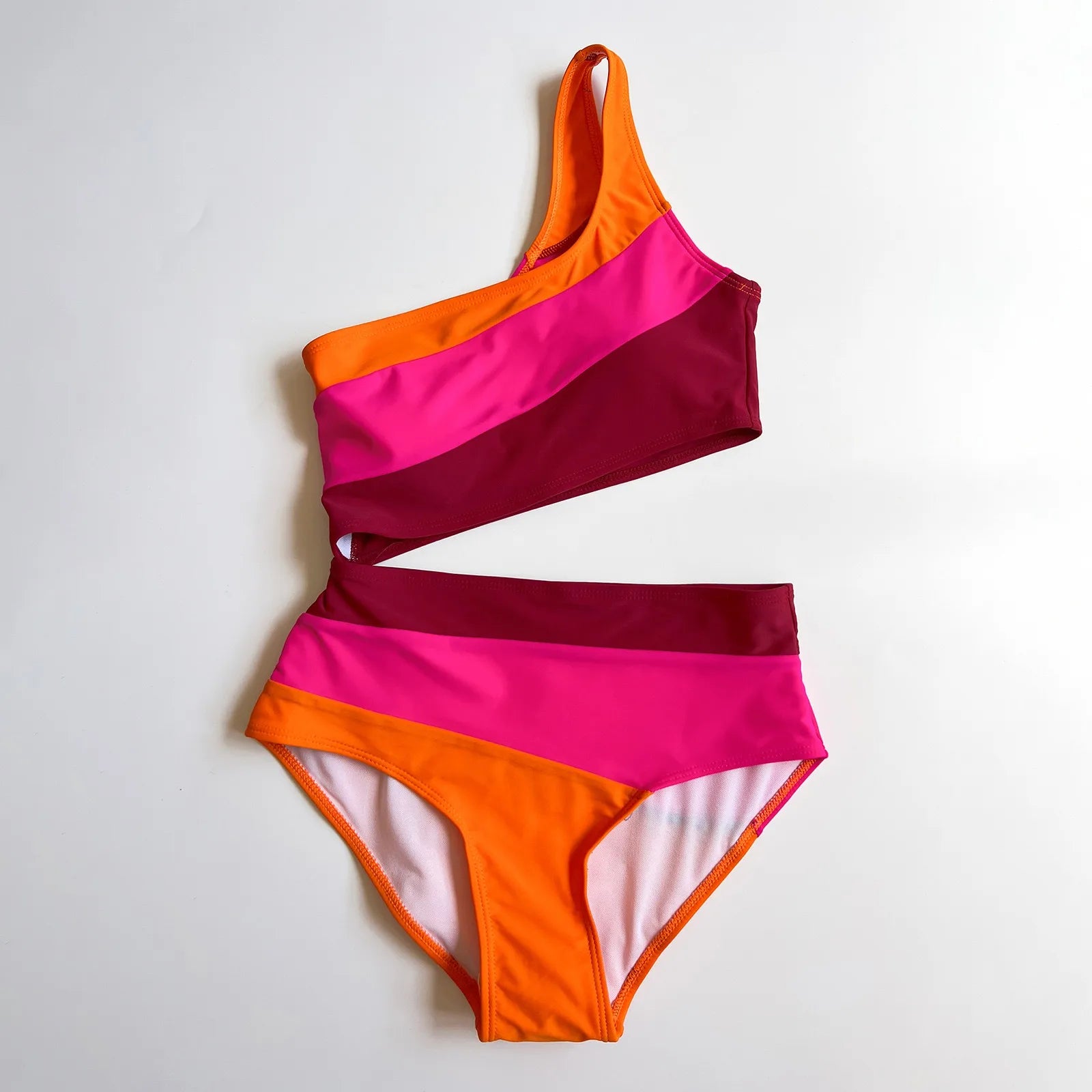 Details: One-shoulder halter, color block, cutout details, shorts, 2-piece set. A bold addition to your swimwear collection.