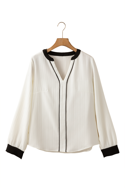 White Colorblock Edge Long Sleeve V Neck Textured Blouse