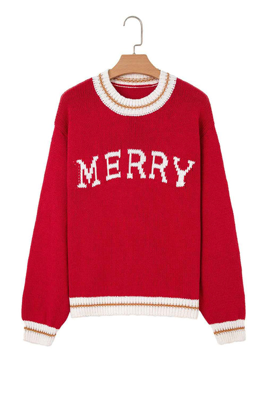Fiery Red Merry Pattern Colorblock Edge Drop Shoulder Cozy Sweater