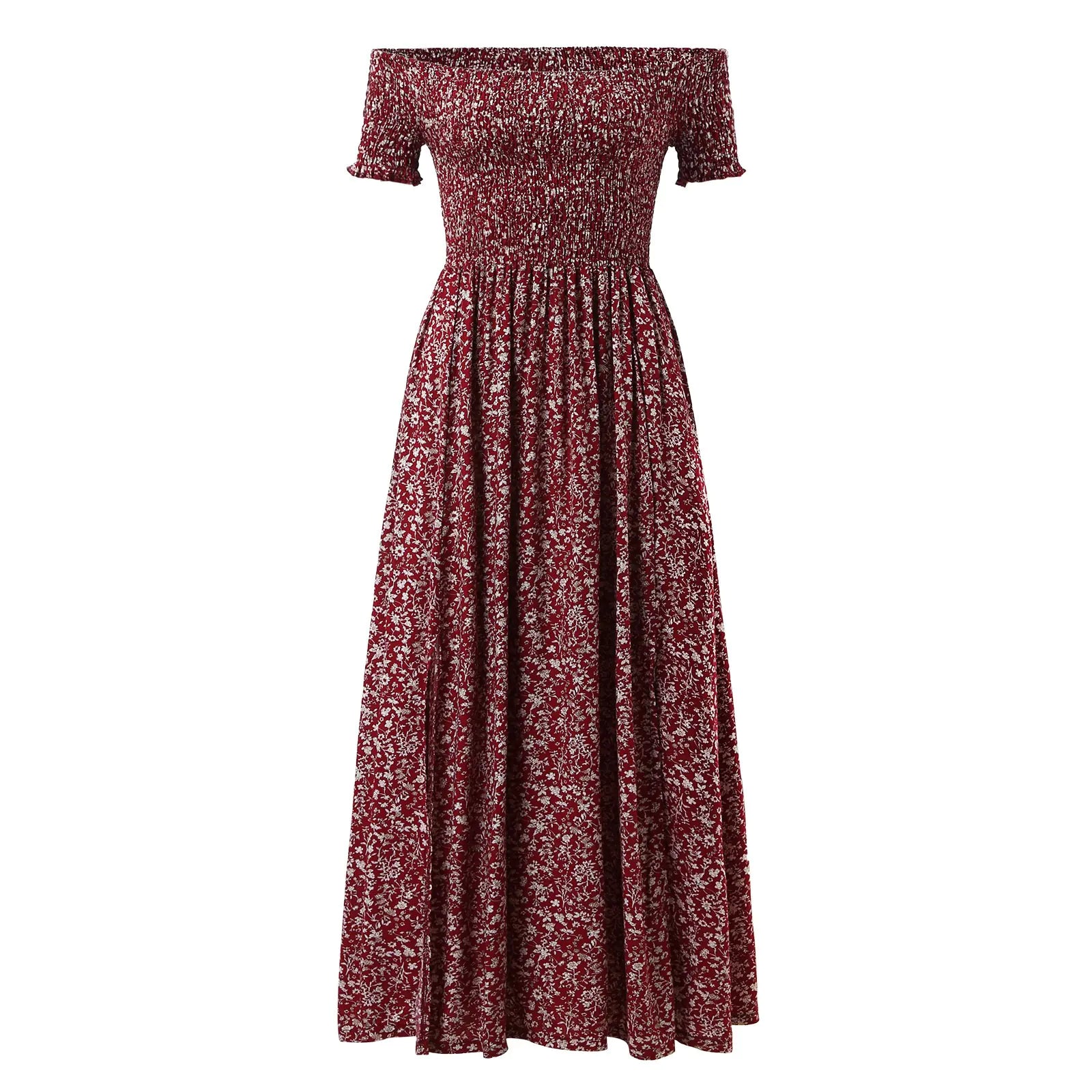This vintage-inspired dress showcases an elegant off-shoulder design that beautifully highlights your neckline. The ankle-length cut offers a flattering silhouette for all body types, while the lightweight fabric ensures comfort during those warm summer days.